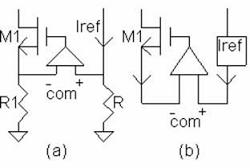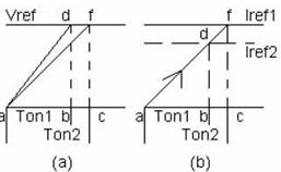 傳統(tǒng)的開關(guān)電源控制電路中,電流極限比較器結(jié)構(gòu)如圖1(a)所示,檢測(cè)電流由M1(senseMOSFET)流入由多個(gè)開關(guān)管和電阻組成的網(wǎng)絡(luò)R1中,該網(wǎng)絡(luò)通過控制開關(guān)管導(dǎo)通或關(guān)斷,改變R1的電阻值,得到不同的占空比。另外一基準(zhǔn)電流流過一阻值固定的電阻R,產(chǎn)生一固定參考電壓。當(dāng)R1的壓降隨檢測(cè)電流上升到參考電壓時(shí),比較器關(guān)斷功率管,保證輸出電壓穩(wěn)定。其工作原理如圖2(a)所示,例如:R1上的電壓從a上升到d,從而關(guān)斷功率管產(chǎn)生一占空比,當(dāng)改變R1的電阻值,R1上的電壓從a上升到f得到另一占空比。從圖1(a)可以看出:傳統(tǒng)的開關(guān)電源電流極限比較器是將兩種電流先轉(zhuǎn)化成電壓再進(jìn)行比較,需要占芯片面積非常大的電阻網(wǎng)絡(luò)和開關(guān)管,并且為保證電阻精度,一般需要激光修調(diào)技術(shù),這大大增加了芯片成本。因此本文在此基礎(chǔ)上提出一種新型的電流極限比較器結(jié)構(gòu)。
