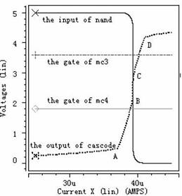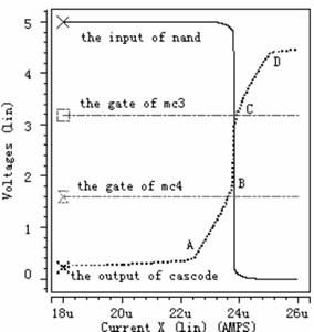 從虛線即cascode結(jié)構(gòu)的輸出電壓波形可以看出,電流極限比較器的工作過程分為五個(gè)階段,第一階段:檢測(cè)電流從0慢慢上升到A,在此過程中,由于檢測(cè)電流遠(yuǎn)小于極限電流,強(qiáng)迫Mc3和Mc4都工作于線性區(qū)。第二階段:檢測(cè)電流從A上升到B,cascode結(jié)構(gòu)的輸出電壓也隨著上升,使Mc4工作于飽和區(qū),Mc3工作于線性區(qū)。但是Mc4只是剛剛進(jìn)入飽和區(qū),還受溝道調(diào)制因素影響,這可從圖中很清析地看出當(dāng)cascode結(jié)構(gòu)的輸出電壓隨檢測(cè)電流上升時(shí),Mc4中電流慢慢接近所設(shè)定的極限電流。第三階段:檢測(cè)電流從B上升到C,此時(shí)檢測(cè)電流已上升到所設(shè)定的極限電流,Mc3和Mc4都工作于飽和區(qū),同時(shí)cascode結(jié)構(gòu)的輸出電壓也上升到后面反相器的中點(diǎn)電壓,經(jīng)過后續(xù)控制電路關(guān)斷功率管。第四階段:檢測(cè)電流從C上升到D,此時(shí)檢測(cè)電流大于所設(shè)定的極限電流,迫使Mc5工作于線性區(qū),雖Mc6還工作于飽和區(qū),但受溝道調(diào)制因素影響,另外Mc3和Mc4工作于飽和區(qū)。第五階段:檢測(cè)電流從D繼續(xù)往上升,迫使Mc5和Mc6都工作于線性區(qū),Mc3和Mc4工作于飽和區(qū)。從圖4中可以看出,當(dāng)檢測(cè)電流達(dá)到4.1μA時(shí),關(guān)斷功率管,滿足系統(tǒng)要求。圖5--圖7的工作情況與圖4類似,圖5設(shè)定極限電流為16μA,可以看出當(dāng)檢測(cè)電流達(dá)到15.97μA時(shí),關(guān)斷功率管。圖6設(shè)定極限電流為24μA,可以看出當(dāng)檢測(cè)電流達(dá)到23.82μA時(shí),關(guān)斷功率管。圖7設(shè)定極限電流為40μA,可以看出當(dāng)檢測(cè)電流達(dá)到39.6μA時(shí),關(guān)斷功率管。