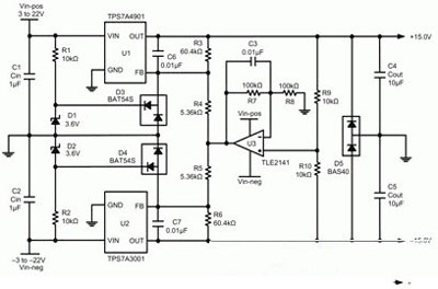 使用對稱分離電源時,正負電壓必須互相追蹤,特別是在電路初次上電時。追蹤電源是一種調節(jié)其輸出電壓至另一個電壓或信號的電源。對于大多數(shù)運算放大器而言,正電源電壓與負電源電壓始終應該大小相等而極性相反。