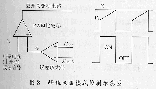 平均CMC由于要采樣濾波電感的電流,有時(shí)顯得不太方便,因此,實(shí)踐中經(jīng)常采用一種變通的電流模式控制方法,即峰值CMC,如圖8所示。電壓外環(huán)輸出控制量(Vc)和由電感電流上升沿形成的斜坡波形(Vs)通過(guò)電壓比較器進(jìn)行比較后,直接得到開(kāi)關(guān)管的關(guān)斷信號(hào)(開(kāi)通信號(hào)由時(shí)鐘自動(dòng)給出),因此,電壓環(huán)的輸出控制量是電感電流的峰值給定量,由電感電流峰值控制占空比。