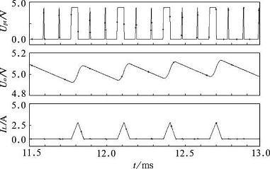 由圖3 可知, 輸出電壓Uo 的紋波隨著電感電流I L 的變化而變化。控制信號(hào)每輸出一個(gè)高能量脈沖,輸出電壓紋波值增大;輸出低能量脈沖時(shí), 輸出電壓紋波值減小, 但是其值始終在5 V 上下范圍內(nèi)波動(dòng)。仿真結(jié)果與實(shí)驗(yàn)設(shè)計(jì)要求一致。