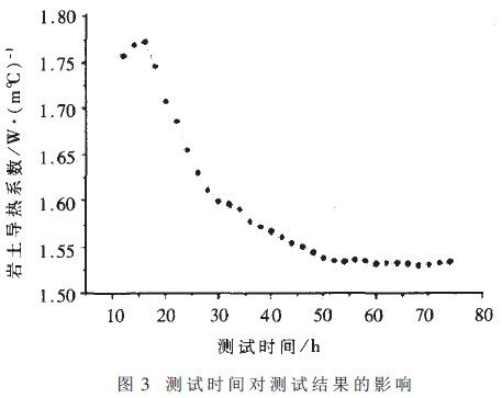 測試時間對測試結果的影響如圖3所示。由圖3可以看出,測試時間不同,計算出的鉆孔周圍地下巖土的平均導熱系數(shù)也不同。當測試時間達到約50小時后,測出的導熱系數(shù)趨于穩(wěn)定,維持在1.530~1.538 W/m℃的范圍之間。通常測試時間可以選取60小時左右,這樣既可以保證獲得正確的導熱系數(shù),又可以避免測試時間過長。