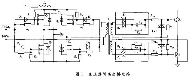 在中頻脈沖滲碳電源中,能快速進(jìn)行過流保護(hù)是至關(guān)重要的,而驅(qū)動(dòng)脈沖無延遲地傳輸,對(duì)實(shí)時(shí)過流保護(hù)起至關(guān)重要作用;同時(shí)為了減少開關(guān)損耗,還要求很陡的驅(qū)動(dòng)脈沖上升沿和下降沿;一些特殊場(chǎng)合要求緊湊而簡(jiǎn)潔、不附加驅(qū)動(dòng)電源等。綜合考慮以上要求,采用變壓器隔離全橋驅(qū)動(dòng)電路,其電路如圖1所示。