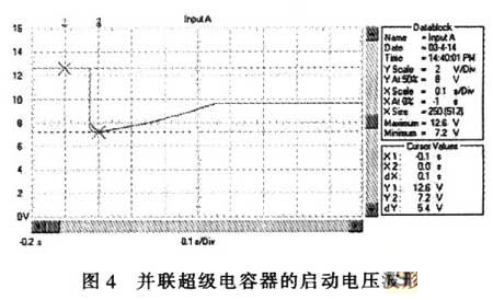 超級電容器與蓄電池并聯(lián)時,汽車啟動過程的電壓波形如圖4所示,電流波形如圖5所示。與圖1和圖2相比,啟動瞬間電壓跌落由只采用蓄電池時的3.2V提升到7.2V;啟動電流從560A提高到l200A;啟動瞬時的電源輸出功率從2kW上升到8.7kW;啟動過程的平穩(wěn)電壓由7V提高到9.4V;啟動過程的平穩(wěn)電流由280A提高到440A;啟動過程的電源平穩(wěn)輸出功率從2.44kW提高到4.12kW。