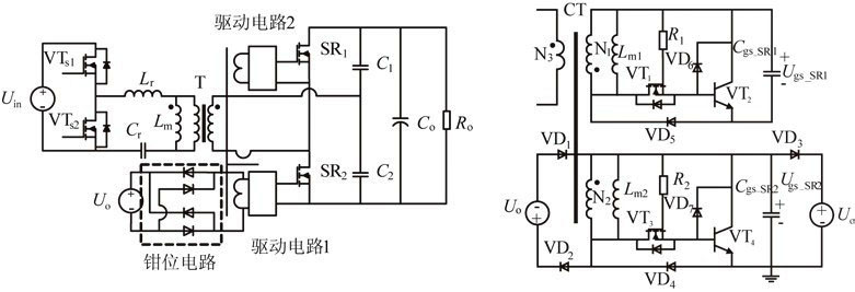 圖7為幾種典型的電流型驅(qū)動方案。傳統(tǒng)的電流型驅(qū)動方案如圖7(a)所示,整個驅(qū)動電路包括一個電流互感器(CT)和一個電壓箝位電路。電路通過電流互感器對電流信號進行采樣,并給同步管提供相應(yīng)的驅(qū)動信號,多余的驅(qū)動能量被箝位電路消耗。該驅(qū)動電路比較簡單,但是有較大的驅(qū)動損耗,限制了變流器效率的提高。因此有文獻提出了具有剩余驅(qū)動能量回饋功能的電流型驅(qū)動方案,如圖7(b)所示。該驅(qū)動電路中多余的驅(qū)動能量能通過輔助繞組回饋到主電路,從而可以較大的減少驅(qū)動電路的損耗,并簡化電流互感器的設(shè)計,但是多繞組的電流互感器大大增加了生產(chǎn)成本。另有文獻提出了一種更為簡單的電流型驅(qū)動方案,如圖7(c)所示。該方案的電流互感器只需一個副邊繞組,同時也具有剩余驅(qū)動能量回饋的功能,更加有利于實際的生產(chǎn)應(yīng)用。通過三極管VTd1,它可以準確地檢測同步整流管應(yīng)該關(guān)斷的時刻,從而保證了同步整流電路的可靠性。