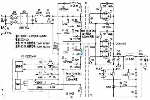 轉(zhuǎn)換IC選用了英飛凌公司第三代高整合功率集成電路——COOLSETF3系列產(chǎn)品ICE385565P,它在單一封裝中,結(jié)合了英飛凌COOLMOS功率金屬氧化層半導(dǎo)體場(chǎng)效應(yīng)晶體管(MOSFET),與新型的脈寬調(diào)制(PWM)控制集成電路。待機(jī)耗電量較其他同類產(chǎn)品少l,3,適用于設(shè)計(jì)更具成本效益、效率更佳的供電系統(tǒng)。