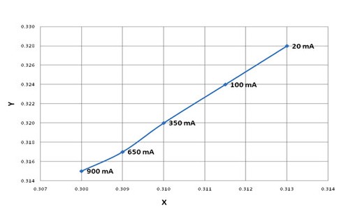 使用減小電流的方法進行LED調(diào)光類似于大多數(shù)白熾燈泡使用的調(diào)光方法。這種減小電流的方法在為數(shù)不多的應用中可以接受,但隨著光等級降低,LED發(fā)出的光色彩也根據(jù)電流而變化。電流較小時,色度(Chromaticity)朝向黃色變化。圖1顯示不同電流時的典型色度變化。