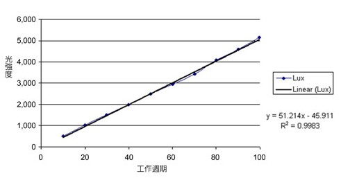 控制訊號的工作頻率為300Hz,脈波寬度為30微秒(μs)。隨著脈波寬度增加,LED導通的總時間也會延長,并提升光輸出。在脈波接近零電平時,光輸出也將接近零。圖5顯示不同工作周期條件下的流明輸出曲線。
