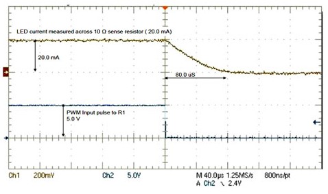 在LED導通期間,流經(jīng)LED的電流保持恒定,使LED發(fā)射的光恒定,且無色度(色彩)變化。亮度與LED導通時間所占的百分比成正比。