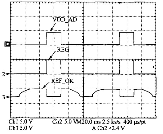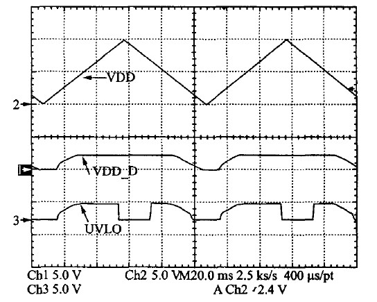 UVLO的啟動(dòng)電流測(cè)量值僅為17.8 A,實(shí)現(xiàn)了系統(tǒng)的低啟動(dòng)電流。系統(tǒng)上電和掉電的測(cè)試結(jié)果如圖11和圖12所示??梢?jiàn)系統(tǒng)在VDD的設(shè)置門限內(nèi)工作良好,REF-OK可以正確指示各個(gè)供電模塊正常工作。掉電過(guò)程正好相反。
