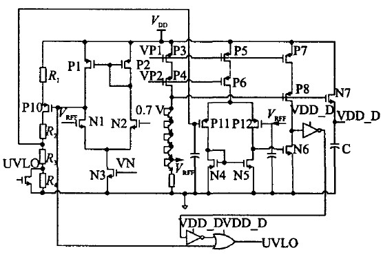 電路的工作原理可簡(jiǎn)述如下:12 V供電電壓可在VDD比較低時(shí)建立一個(gè)PTAT (ProportiONal toabsolute temperature)電流源,然后利用其建立起帶隙基準(zhǔn)電壓源;當(dāng)VDD由0上升時(shí),帶隙基準(zhǔn)電壓r首先建立,此時(shí)兩個(gè)比較器的輸出為低電位,P1導(dǎo)通,輸出為高電位;當(dāng)K1VDD大于 r時(shí),COMP1輸出跳變,N1管導(dǎo)通,鎖存器鎖存上一個(gè)信號(hào),UVLO為高電位(注意其為低電位有效);當(dāng)K2VDD大于VREF 時(shí),N2導(dǎo)通,則UVLO-out為低電位,使能其他模塊;隨著VDD減小,K2VDD首先小于VREF,N2關(guān)斷,則鎖存器鎖存信號(hào),UVLO-out保持;當(dāng) VDD減小到K1 VDD小于VREF時(shí)COMP1跳變,P1導(dǎo)通,N1關(guān)斷,則輸出UVLO-out為高電位,關(guān)斷整個(gè)控制芯片。
