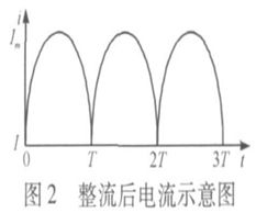 在開關電源中, 工頻交流電流經(jīng)過整流橋后, 不再是單一頻率點的交流電流, 而是單向的脈動直流電流,其波形如圖2所示, 利用傅里葉變換可得: