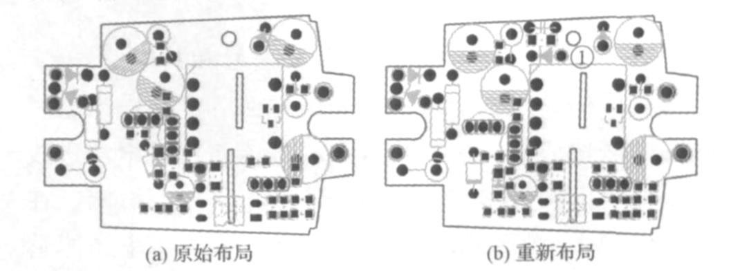 從圖4中可以看出在2 MH z頻率點附近最大超出為5 dBuV.為保證能夠順利通過認證機構(gòu)的實驗室測試, 一般要求預測試結(jié)果比標準限制低2 dBuV,希望盡量能夠比標準限值低6 dBuV.所以從圖4可知該產(chǎn)品的預測試結(jié)果并不理想。初步分析測試圖,可能性最大的原因是開關管工作時產(chǎn)生的干擾把2MH z頻率點附近的噪聲電平底部懸空, 從而把傳導干擾的電平抬高。而在傳導發(fā)射測試中, 1 MH z~2MH z的頻率信號干擾是由共模電流產(chǎn)生的占主要分量[ 10] .所以初步定性為電流回路對參考地形成的干擾信號。為了能夠一次性解決問題以達到標準限值要求, 把可能出現(xiàn)問題的地方都加以改進, 本研究提出了解決方案: ①按照上述措施對線路板進行重新布局, 原始布局如圖5( a)所示, 圖中布局雖然按照主電流流向排布, 但缺乏考慮各個子路之間的相互關系。重新布局如圖5( b)所示, 在無法改變PCB板的結(jié)構(gòu)下, 盡可能地將器件排列整齊, 方向一致, 同時增大開關管與變壓器之間距離。② 變壓器初級增加并聯(lián)旁路濾波電容, 并聯(lián)電容值為1 000 pF /1 kV, 用來降低干擾信號對共模電流回路產(chǎn)生的影響。