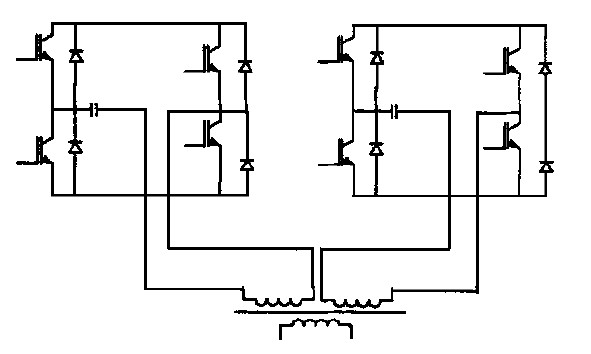 當負載電容容量小且重復頻率高時, 一種設計思想是改進控制電路, 使其達到的效果相當于: 在每一個充電周期開始階段, 使用諧振電流大的主電源快速充電至預設電壓, 隨后轉為小電流電源充電, 在T w 階段向負載提供很小的電量以減小波動; 另一種技術路線采用雙橋路的移相控制電路, 如圖7 所示,這種電路非常適合大功率充電的應用場合。EM I 公司的30kJ/s , 50kV 電源采用了此項技術。