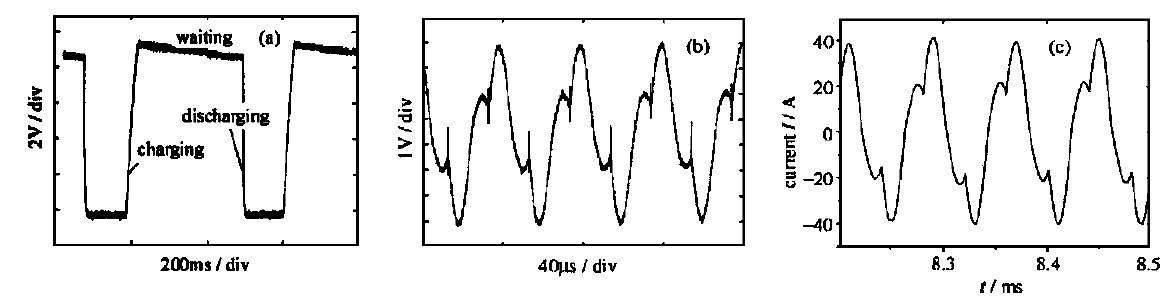 圖6 是某調制器充電電源波形圖, 該電源充電功率可達2kJ/s , 工作頻率12. 5kHz, 電壓30kV.測量用的示波器型號為泰克TDS3032.V s= 500V , C r= 0. 4uF,L r= 158uH, T s= 80us, 變壓器副邊為雙繞組,每繞組升壓比1∶40, Cload= 0. 66uF.實際電路中L r 完全利用了變壓器的漏感, 且漏感選擇較大以減小分布電容。圖6 (c) 是該電源諧振開關電流的仿真波形, 和實測波形比, 吻合得很好。