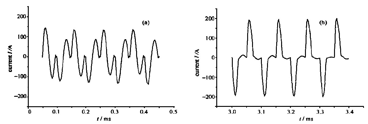 忽略回路電阻, 電路的特征阻抗為Z =√ L/C , 諧振周期為T r = 2π √L/C , 其中C 是諧振電容C r 和折合到原邊的負載等效電容C''串聯后形成的總電容, 通常因高壓變壓器變比高, 等效電容C ''和C r相比較大, 因此串聯后的總電容C 和C r 相差不大。完整的充電電流波形包絡及充電電壓如圖4 所示, 其中t1是轉折點, t1 以前是線性等臺階充電, t1 以前電流波形放大如圖5 (a) 所示, 轉折點附近的電流波形如圖5(b) 所示。