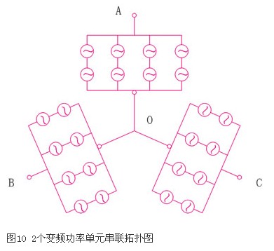 圖9所示的是1/2全電壓等級(jí)6.6kv的拓?fù)鋱D:由4個(gè)變頻功率單元串聯(lián)組成1個(gè)變流鏈,每相由2個(gè)變流鏈相并聯(lián),實(shí)現(xiàn)6.6kv等級(jí)的三相交流恒功率5000kva輸出。