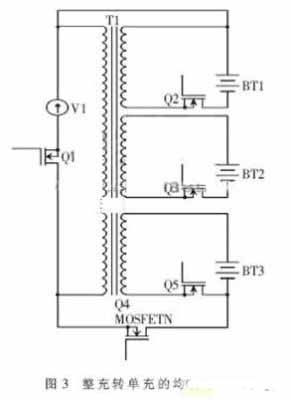 電池組常用的均衡方法有分流法、飛速電容均衡充電法、電感能量傳遞方法等。在本系統(tǒng)中,需要較多的I/O口驅(qū)動(dòng)開關(guān)管,而單片機(jī)的I/O口有限,所以采取整充轉(zhuǎn)單充的充電均衡方法。原理圖如圖3所示。Q4是控制電池組整充的開關(guān),Q2、Q3、Q5是控制單節(jié)電池充電的開關(guān)。以10節(jié)錳酸鋰電池組為例,變壓器主線圈兩端電壓為42 V,副線圈電壓為電池的額定電壓4.2 V。剛開始Q4導(dǎo)通,Q2、Q3、Q5截止,單節(jié)電池的電壓不斷升高,當(dāng)檢測(cè)到某一節(jié)電池的電壓達(dá)到額定電壓4.2 V以后,電壓檢測(cè)芯片發(fā)出驅(qū)動(dòng)信號(hào),關(guān)閉Q4,打開Q2、Q3、Q5,整個(gè)系統(tǒng)進(jìn)入單充階段,未充滿的電池繼續(xù)充電,以達(dá)到額定電壓的電池保持額定電壓不變。經(jīng)測(cè)試,電壓差值不會(huì)超過(guò)50 mV。