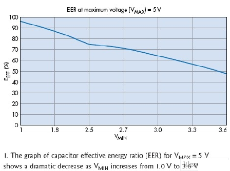 從設(shè)計(jì)角度看,超級(jí)電容和電池的根本區(qū)別在于電容器在充/放電周期發(fā)生的顯著電壓變化。充電時(shí),理論上,電容器的電壓從零上升到其最高額定電壓,而電池的端電壓在其工作周期中變化很小。超級(jí)電容是電子電容器的一個(gè)子集。可通過下式得出能從超級(jí)電容放電周期中(放電周期是指電容器的端電壓從其最大值VMAX變?yōu)樽畹凸ぷ麟妷篤MIN的過程)獲得的有效能量EEFF: