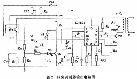 當(dāng)負載過流時,經(jīng)脈沖變壓器次級耦合,其初級也過流,流過R24的壓降增大,光耦PHT導(dǎo)通,SG1524的10腳電壓被抬高,SG1524關(guān)閉,無輸出電壓,從而保護電源。