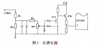 高壓經(jīng)R30,R31分壓濾波送至場效應(yīng)管V17,經(jīng)V17電壓放大后,再經(jīng)射隨器輸出,送至SG1524的1端。假設(shè)電源電壓降低或負載電阻變小引起輸出電壓降低時,則反饋到SG1524內(nèi)的誤差放大器反相輸入端1的電壓將減小,誤差放大器輸出電壓將增加,從而使加到脈寬調(diào)制比較器反相輸入端電壓增大,輸出晶體管的導(dǎo)通時間變大,故功率晶體管導(dǎo)通時間也變長,占空比Q變大,從而使輸出電壓Vo能回到原來的穩(wěn)定值。反饋電路如圖3所示。