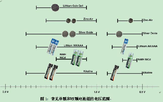 多數(shù)低端和中端便攜式產(chǎn)品都會使用可替換的電池或充電電池,這些電池還能由使用者自行更換。如圖1所示,剛充完電時的單節(jié)電池電壓通常會在1.2-1.6V之間,電力耗盡時則下降至0.9-1.0V。把兩個單節(jié)電池串聯(lián)即可提供1.8-3.2V之間的電壓。