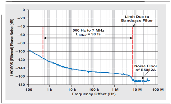 圖 12 所示曲線圖描述了濾波后 CDCE72010 LVCMOS 輸出的測得輸出相位噪聲。131000 點的 FFT 大小將低積分帶寬設(shè)定為 ~500 Hz。積分上限由帶通濾波器設(shè)定,其影響在相位噪聲曲線圖中清晰可見。超出曲線圖所示帶通濾波器限制的相位噪聲為 E5052A 的噪聲底限,不應(yīng)包括在抖動計算中。濾波后相位噪聲輸出的積分帶來 ~90 fs 的時鐘抖動。