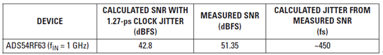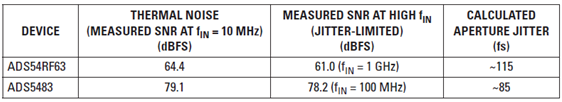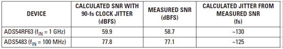 我們知道時鐘源生成器濾波后輸出的外部時鐘抖動為 ~35 fs,因此我們可以利用測得的 SNR 結(jié)果,然后對第 1 部分(請參見參考文獻 1)中的方程式 1、2 和 3 求解孔徑抖動值,從而計算得到 ADC 孔徑抖動,請參見下面的方程式 4。表 3 列舉了每種 ADC 測得的 SNR 結(jié)果以及計算得孔徑抖動。