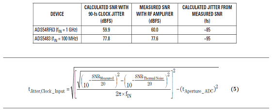 通過在時鐘輸入通路中安裝低噪聲 RF 放大器,兩個數(shù)據(jù)轉(zhuǎn)換器重復(fù)進行了高輸入頻率的 SNR 測量,其結(jié)果如表 5 所示。我們可以看到,測得 SNR 和預(yù)計 SNR 匹配的非常好。使用下面的方程式 5,計算得到的時鐘抖動值在 90-fs 時鐘抖動的 5 fs 以內(nèi),其結(jié)果通過相位噪聲測得推導(dǎo)得出。