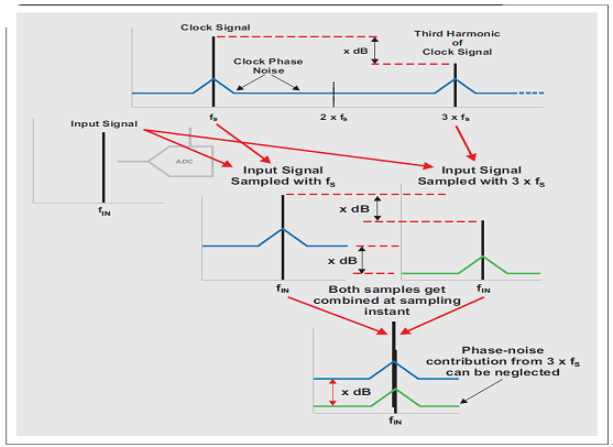 在采樣時間,基頻正弦波及高階諧波與輸入信號混頻,如圖 16 所示。(為了簡單起見,僅顯示了一個諧波。)因此,三階諧波周圍的相位噪聲與輸入信號混頻,而第三諧波也形成一個混頻結(jié)果。但是,由于時鐘信號的第三諧波的振幅更低,因此該混頻結(jié)果的振幅也被降低。