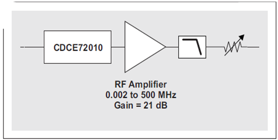 改善轉(zhuǎn)換速率的一種方法是:在 CDCE72010 的 LVCMOS 輸出和帶通濾波器之間添加一個具有相當(dāng)量增益的低噪聲 RF 放大器,參見圖 14。該放大器應(yīng)該放置于濾波器前面,這樣便可以將其對時鐘信號的噪聲影響程度限定在濾波器帶寬,而非 ADC 的時鐘輸入帶寬。由于下一個試驗的放大器具有 21 dB 的增益,因此我們在帶通濾波器后面增加了一個可變衰減器,旨在匹配濾波后 LVCMOS 信號到時鐘生成器濾波后輸出的轉(zhuǎn)換速率。該衰減器可防止 ADC 的時鐘輸入超出最大額定值。