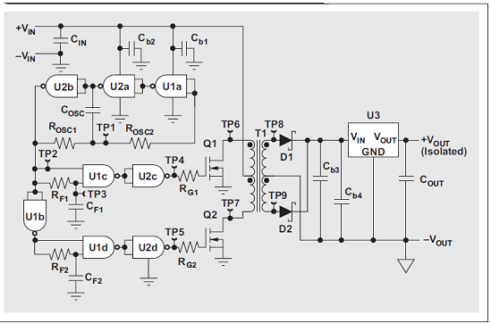 如果應(yīng)用要求 2 kV 以上的隔離電壓、60% 以上的轉(zhuǎn)換器效率或者標(biāo)準(zhǔn)組件可靠的有效性,那么分立設(shè)計就是一種能夠替代集成組件的低成本方案。分立 DC/DC 轉(zhuǎn)換器設(shè)計的缺點是需要做大量的工作——選擇穩(wěn)定的振蕩器結(jié)構(gòu)和先斷后通電路,選擇可以通過標(biāo)準(zhǔn)邏輯門有效驅(qū)動的MOSFET,適宜實施溫度和長期可靠性測試。所有這些努力都要花費時間和資金。因此,在倉促進行這樣一個計劃以前,設(shè)計人員應(yīng)該考慮到下列事項:集成組件通常已通過溫度測試,并且擁有其他工業(yè)資質(zhì)。這些組件不僅僅是最可靠的解決方案,而且還擁有較快的上市時間。