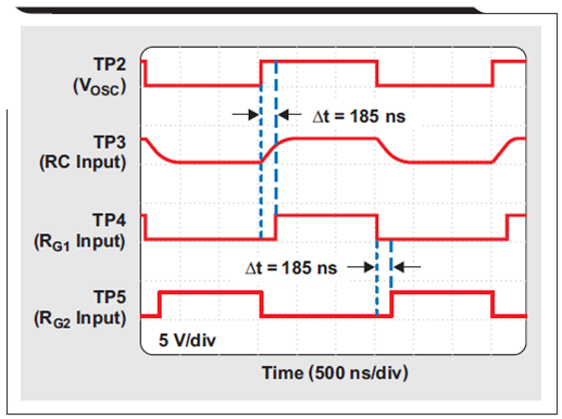 施密特觸發(fā)電路 NAND 柵極(U1c、U1d)實現(xiàn)先斷后通功能,以避免 MOSFET 導(dǎo)通階段交疊。其他兩個NAND門(U2c,U2d)配置為反相緩沖器,從而產(chǎn)生驅(qū)動 N 通道 MOSFET(Q1、Q2)必需的正確信號極性。圖 3 顯示了完整的先斷后通動作。為了適應(yīng)標(biāo)準(zhǔn)邏輯門的有限驅(qū)動能力,我們選擇了 MOSFET,因為其較低的總電荷和較短的響應(yīng)時間。