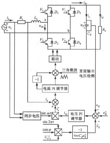 單相全橋電壓型PWM 整流器選擇響應(yīng)速度較快的三角波電流比較法作為控制策略。因反饋到電壓外環(huán)的輸出電壓含有紋波電壓,而紋波電壓的存在將導(dǎo)致電流內(nèi)環(huán)的給定電流發(fā)生畸變,因此本文采用補(bǔ)償輸出直流電壓中紋波電壓的方法[4]來(lái)減少流入電壓控制環(huán)的紋波電壓,從而改善給定電流的波形。按照以上原理設(shè)計(jì)的單相全橋電壓型PWM整流器的控制系統(tǒng)結(jié)構(gòu)如圖4所示。