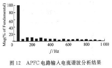 單相APFC電路采用Matlab7.6進(jìn)行建模與仿真。圖10為APFC電路輸入電壓和電流波形,可見(jiàn)網(wǎng)側(cè)輸入電流由窄脈沖波形變成正弦電流波形,且與輸入電壓同相位。圖11為APFC電路輸出電壓波形,可見(jiàn)經(jīng)過(guò)60ms的軟啟動(dòng)過(guò)程之后,輸出電壓穩(wěn)定在400V左右,滿足設(shè)計(jì)要求。圖12為APFC電路輸入電流諧波分析結(jié)果,可見(jiàn)除基波外,其余諧波含量均很小。
