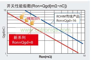 進一步微細化,同時,采用羅姆獨家的低容量構造和新的“溝槽式場板結構”,實現(xiàn)了低容量與低導通電阻兼?zhèn)涞脑?。與羅姆傳統(tǒng)產品相比,表示功率MOSFET的性能指數(shù)的“FOM”數(shù)值可降低50%。