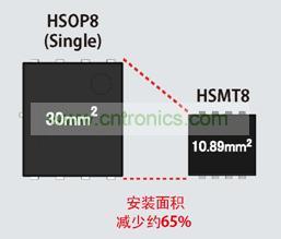 根據(jù)不同用途,提供3種小型封裝。HSMT8比HSOP8的安裝面積減少了65%,為節(jié)省空間做出巨大貢獻。而且,產品陣容中還包括DC/DC電源電路中的高邊(High Side)用MOSFET與低邊(Low Side)用MOSFET復合化的新封裝HSOP8(Dual)。不僅安裝面積減小,而且還可有助于減少安裝次數(shù)。