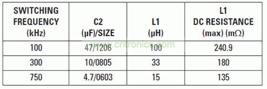 本例中,我們可以通過750-kHz開關(guān)頻率來產(chǎn)生一個5-V輸出電壓(參見表2)。但是,如果該頻率為1 MHz,則最低可能輸出電壓被限制為約6V;否則,DC/DC轉(zhuǎn)換器會跳過脈沖。替代方法是降低輸入電壓或者頻率。在選擇某個開關(guān)頻率以前,你最好是先查看DC/DC轉(zhuǎn)換器數(shù)據(jù)表,了解保證最小可控“導通”時間。