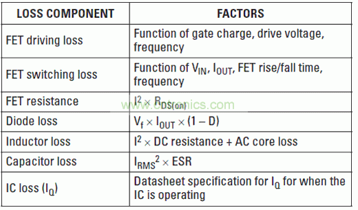 DC/DC轉(zhuǎn)換器的效率,是進行電源設(shè)計時需要考慮的最重要屬性之一。低效率會轉(zhuǎn)換成高功耗,必須要在印刷電路板(PCB)上使用單獨的散熱器或者更多的銅,才能處理這些功耗。功耗也對電源上游器件提出了更高的要求。如表3所示,功耗共有幾個組成部分。