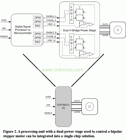 圖 2 具有雙極步進(jìn)馬達(dá)控制用雙功率級的一個處理單元,可以集成到一個單片解決方案中。