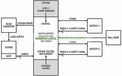 圖3 LTC1760雙電池充電器/選擇器系統(tǒng)架構(gòu)