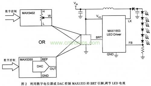 但在當(dāng)前的許多應(yīng)用中,DAC與數(shù)字電位器之間選擇的界限比較模糊,圖2中的DAC和數(shù)字電位器都可用于控制MAXl553 LED驅(qū)動(dòng)器。MAXll53亮度(BRT)輸入的直流電壓和檢流電阻決定了LED的電流。
