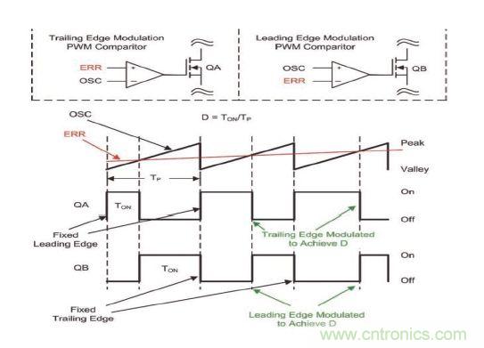 后沿脈寬調(diào)制比較器通過(guò)對(duì)比鋸齒電壓波形(OSC)和誤差電壓(ERR)來(lái)控制功率轉(zhuǎn)換器占空比(D)。一般,誤差電壓由一個(gè)反饋運(yùn)算放大器控制。在后沿脈寬調(diào)制中,OSC引腳被饋送給脈寬調(diào)制比較器的負(fù)輸入,而誤差電壓則饋送至脈寬調(diào)制比較器的非反相輸入。脈寬調(diào)制比較器的輸出用于控制功率轉(zhuǎn)換器(QA)的FET柵極。該柵極驅(qū)動(dòng)導(dǎo)通信號(hào)與OSC信號(hào)波谷同步。在這種配置結(jié)構(gòu)中,F(xiàn)ET柵極驅(qū)動(dòng)的后沿經(jīng)過(guò)調(diào)制,以達(dá)到功率轉(zhuǎn)換器占空比 (D)。該后沿為FET關(guān)斷時(shí)(請(qǐng)參見(jiàn)圖 1)。