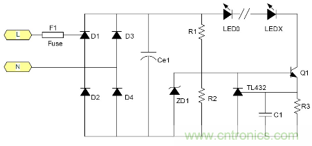 C1為降壓電容器, D1, 2, 3, 4為橋式整流二極管, ZD1是穩(wěn)壓二極管, R1為關(guān)斷電源后C1的電荷泄放電阻。