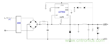 隨著目前法規(guī)和能效的需求, 針對(duì)LED應(yīng)用提出高PF以及適應(yīng)全電壓范圍都能可靠工作的要求, 并且朝小型化方面發(fā)展, 因此之前的填谷式的PFC電路也需要增加兩個(gè)高壓電容因體積的限制不太適合應(yīng)用。有鑒如此, 國(guó)內(nèi)外很多廠商都推出了適應(yīng)球泡燈和T管之類的非隔離電源應(yīng)用驅(qū)動(dòng)方案, 下面就以通嘉科技的LD7832做為典型介紹。