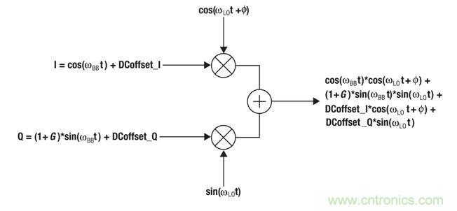 DC 偏移會與 LO 混頻,產(chǎn)生 LO 饋通,即?LO的頻率。I和Q分支的DC偏移加入正交,形成以下的LO饋通振幅: