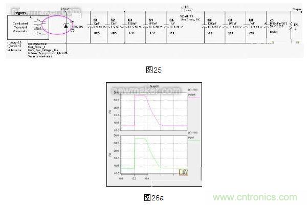 2) 脈沖2a 模擬由于線束電感的原因,使與DUT并聯(lián)的裝置內(nèi)電流突然中斷引起的瞬態(tài)現(xiàn)象;脈沖2b 模擬直流電機(jī)充當(dāng)發(fā)電機(jī),在點(diǎn)火開(kāi)關(guān)斷開(kāi)時(shí)的瞬態(tài)現(xiàn)象。仿真結(jié)果見(jiàn)圖15a。