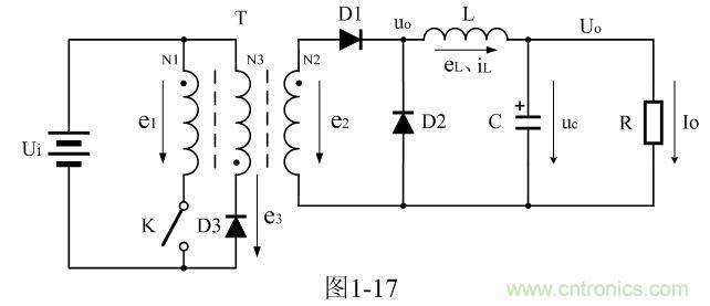圖1-17是正激式變壓器開關(guān)電源的簡單工作原理圖,圖中,Ui是開關(guān)電源的輸入電壓,T是開關(guān)變壓器,N1、N2、N3分別為開關(guān)變壓器的3個線圈繞組,e1、e2、e3分別為3個線圈繞組產(chǎn)生的感應(yīng)電動勢,K是控制開關(guān),D1是整流二極管,D2是續(xù)流二極管,D3是削反峰整流二極管,L是儲能濾波電感,C是儲能濾波電容,R是負(fù)載電阻;uo為整流輸出電壓,或濾波輸入電壓、eL為儲能濾波電感產(chǎn)生的感應(yīng)電動勢、iL為流過儲能濾波電感L的電流、Uo為濾波輸出電壓、Io為流過負(fù)載的電流。