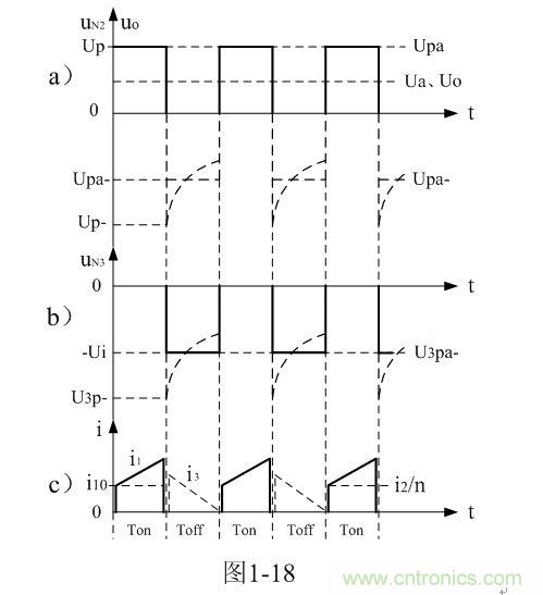 圖1-18-c)是流過變壓器初級線圈N1和次級線圈N3的電流波形,其中,實(shí)線部分是流過變壓器初級線圈N1的電流波形,虛線部分是流過變壓器次級線圈N3的電流波形。