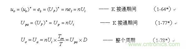 根據(jù)圖1-17,加到開關(guān)器件(控制開關(guān))兩端的峰值電壓UKP正好等于輸入電壓Ui與反電動勢峰值Up-之和,即: